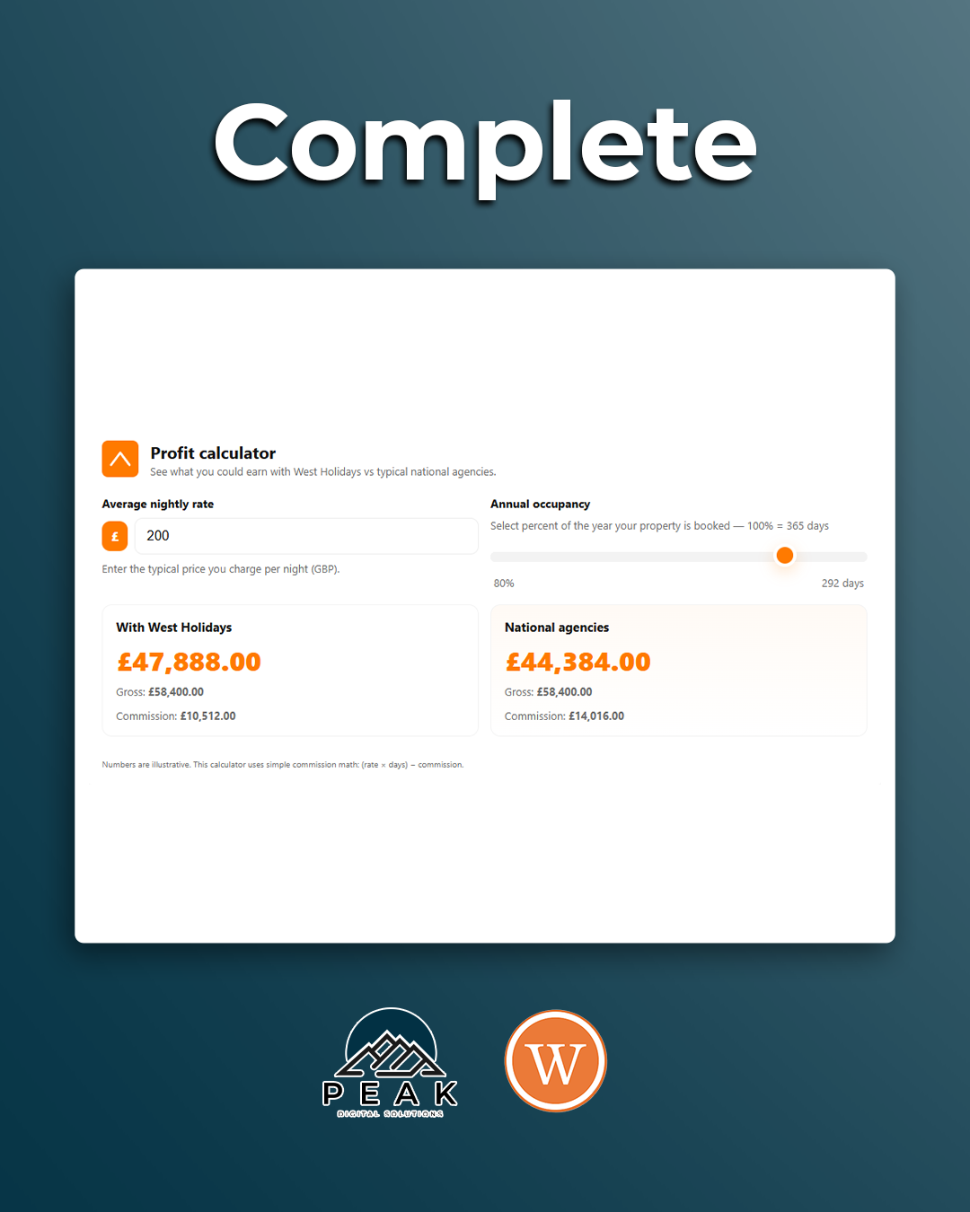 Instead, we created an interactive profit calculator that allows owners to input details about their own property and see a personalised illustration of what they could earn with West Holidays compared to national agencies.